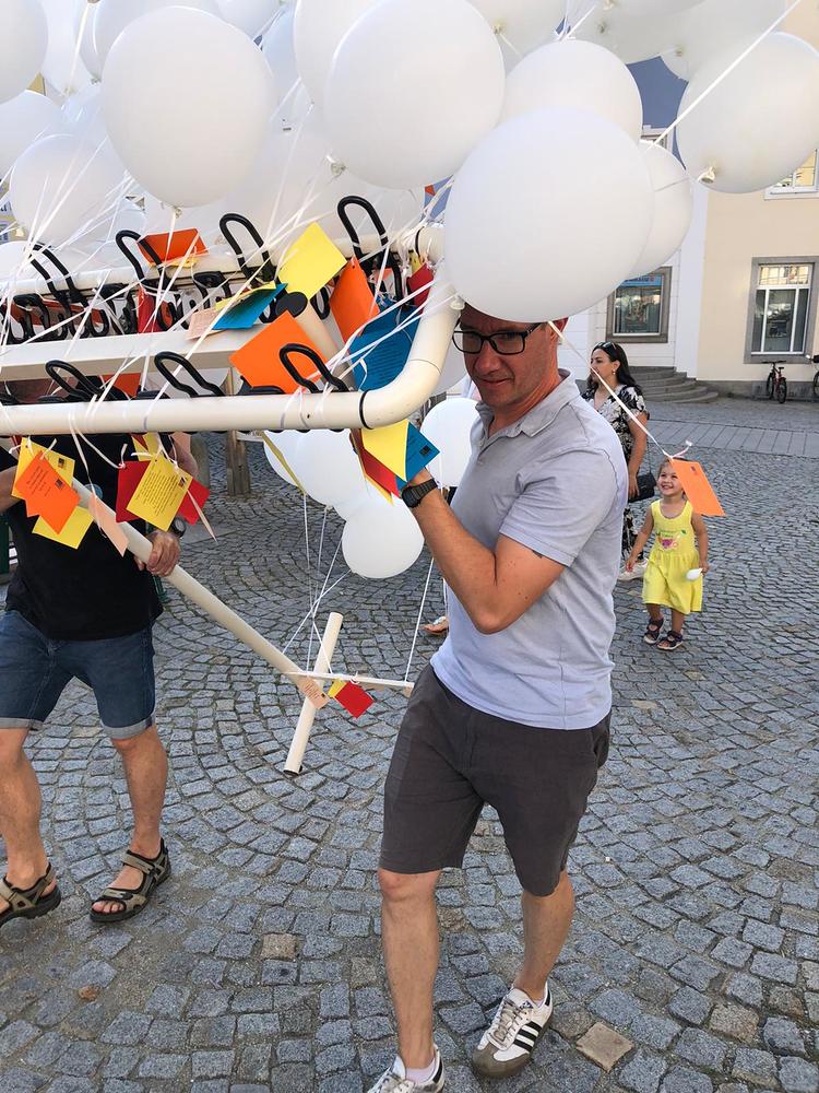 Danach wurden die Teilnehmer*innen eingeladen, selbst Hand anzulegen und mit Ziegelsteinen ein großen Friedenszeichen auf den Boden zu legen. Den Abschluss bildete ein Luftballonstart, der Friedensbotschaften in die Weite trug.